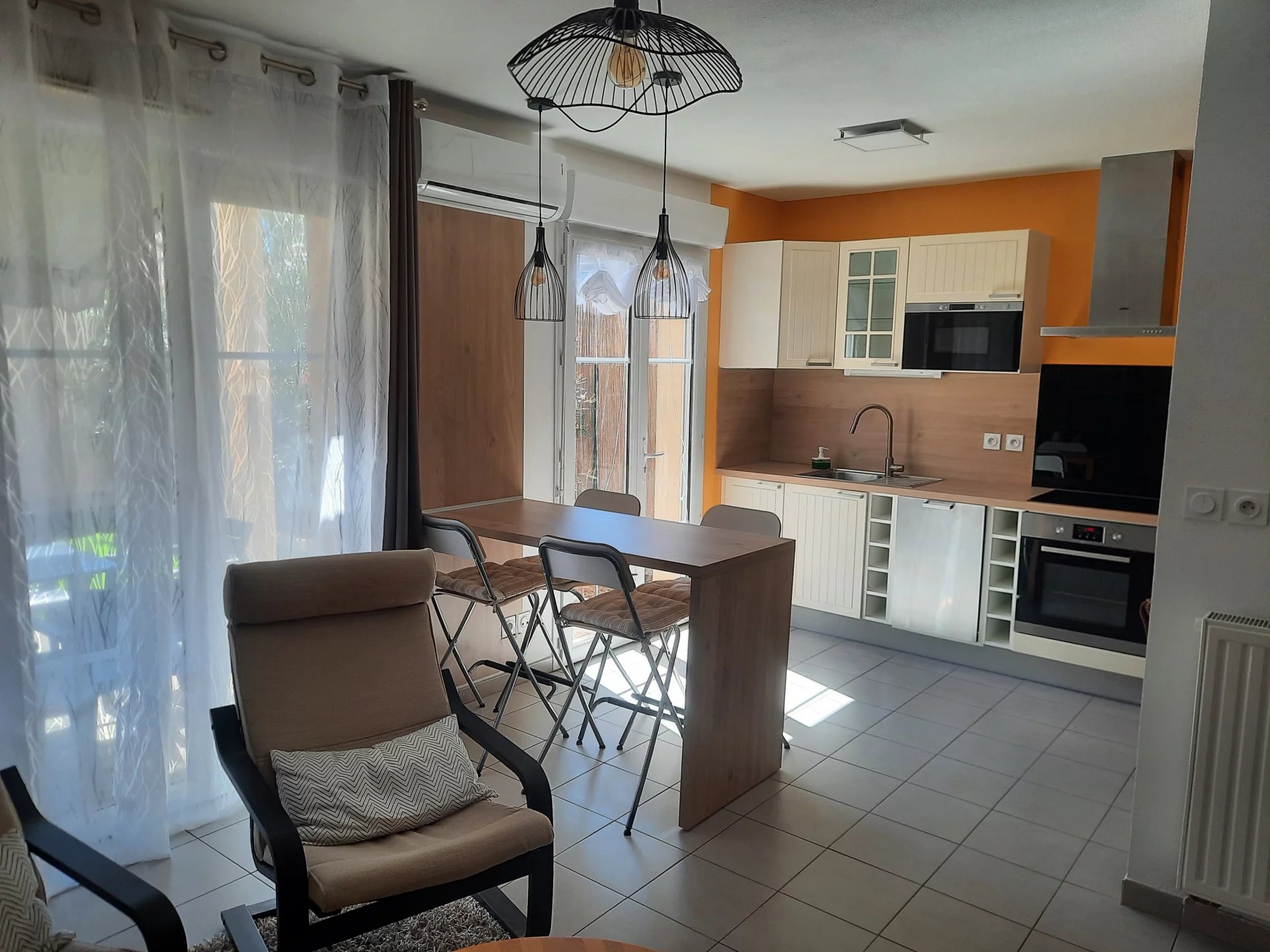 Au rez-de-chaussée, on retrouve un séjour ouvert sur la cuisine entièrement équipée, une petite buanderie, toilettes séparées et un espace de rangement.